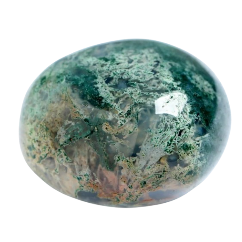 Moss Agate — een steen die kalmte en balans brengt en helpt bij het loslaten van stress. Het bevordert een diepere verbinding met de natuur en ondersteunt persoonlijke groei en innerlijke rust. Draag deze steen om je geaard en stabiel te voelen, klaar om nieuwe uitdagingen met een open en positieve houding tegemoet te treden.